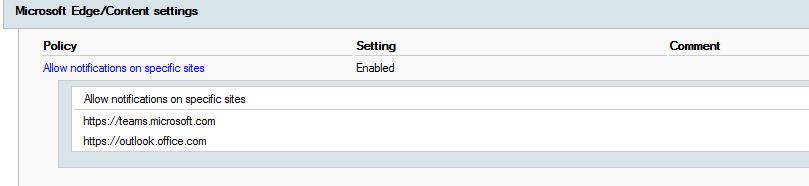 Configure this by configuring Allow notifications on specific sites for the following sites under: