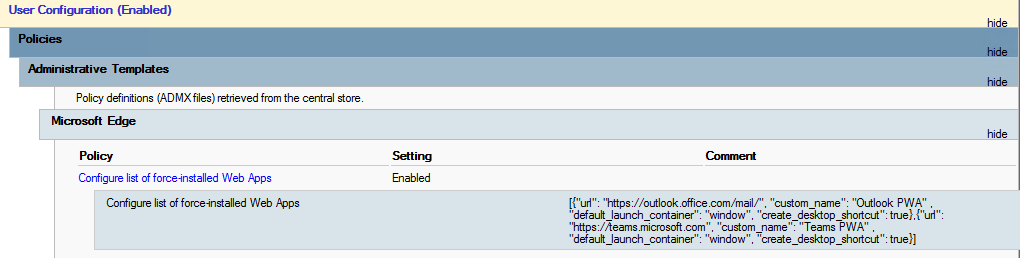 To distribute the Teams and Outlook PWAs, we use Microsoft Group Policies in a traditional on-premises environment. Alternatively, Microsoft Intune can also be used to deploy these settings.