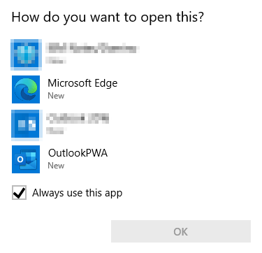 After configuring the custom Outlook PWA protocol handler, users may encounter a Windows dialog when clicking an mailto link, such as: