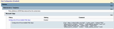 The first step is to configure the following Group Policy setting: “Configure the list of force-installed Web Apps”, located under: