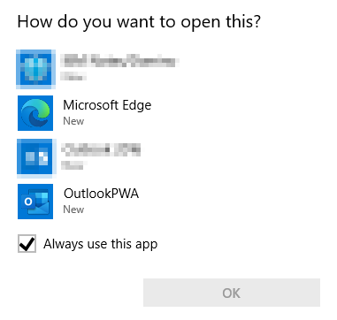 When setting up Outlook PWA as the default mail client, Windows may prompt the user once with “How do you want to open this?”. To avoid this, follow these steps: